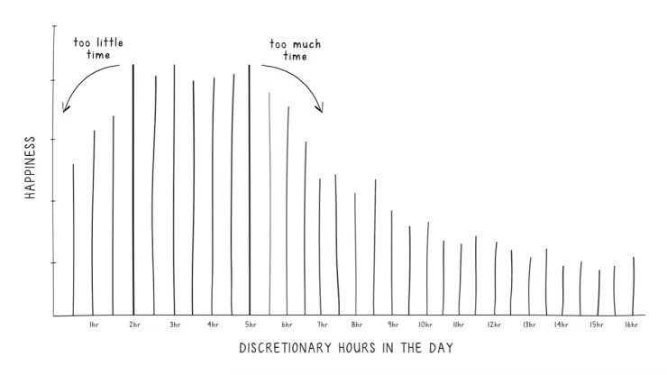 …two to five hours of free time in a day is ideal for boosted happiness. Having less than two hours or more than five hours of free time a day, however, decreased happiness.